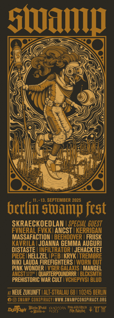 From September 11–13, 2025, Neue Zukunft in Berlin once again becomes the dark playground of the Berlin Swamp Fest – and this year marks a special milestone: for the tenth edition, fans, musicians, and artists gather for crushing riffs, bizarre art, and bloody horror.