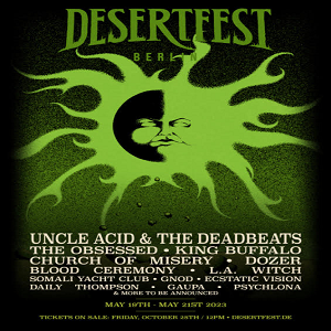 DESERTFEST BERLIN has announced the first names for its 2023 edition, and is happy to welcome UNCLE ACID & THE DEADBEATS, THE OBSESSED, KING BUFFALO, CHURCH OF MISERY, DOZER, BLOOD CEREMONY, L.A. WITCH, SOMALI YACHT CLUB, GNOD, ECSTATIC VISION, DAILY THOMPSON, GAUPA and PSYCHLONA, with many more acts to be announced soon!