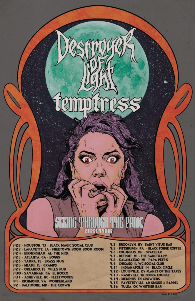 Hey East Coast friends, remember that tour we had to cancel back in 2020? Well, we are coming back and this time bringing our Texas friends with us, Temptress. Hope to see ya out there. Poster art by Daniel Marschner.