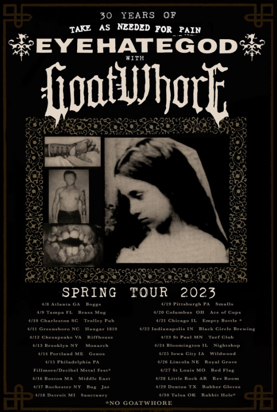 Eyehategod coomented: “This year we celebrate 30 years of Take As Needed For Pain with fellow New Orleanians Goatwhore, kicking off April 8th. This tour includes a performance of the record in full at the Decibel Metal and Beerfest…See y’all down the road!“