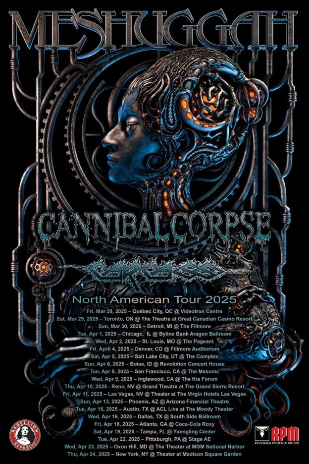 MESHUGGAH will headline the run with full support from the iconic and equally legendary Cannibal Corpse and Carcass, both of whom are renowned for their visceral and compelling musical styles. This lineup creates a powerhouse of intense performances, blending Meshuggah‘s innovative Metal Fusion with the Brutal Death Metal of Cannibal Corpse and the melodic engagements of Carcass.