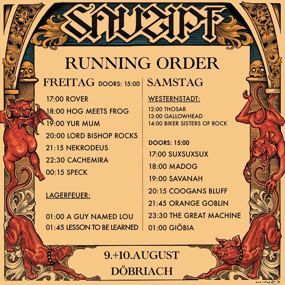 Sauzipf Rocks announces running order for this year’s edition featuring Orange Goblin (UK), Giöbia (Italy), Cachemira (Spain), Speck (Austria), Savanah (Austria), The Great Machine (Israel), Nekrodeus (Austria), Thosar (Austria) and many more.