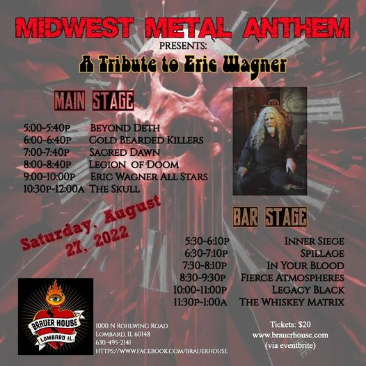 Midwest Metal Anthem will pay tribute to Wagner with two stages of music featuring The Skull with Agell and Reagers on vocals as well as the Eric Wagner Allstars (AKA Kulvera) featuring Chuck Robinson (Trouble, Black Finger, Eric Wagner), Dave Snyder (Trouble, Black Finger, Eric Wagner), Brian Balich (Penance, Argus), Greg Ball (Earthride), and Matt Cross (Black Finger, Eric Wagner) and the debut of Legion Of Doom featuring members of The Skull, Saint Vitus, Pentagram, and others playing songs from their collective past. See below for confirmed dates and further info.